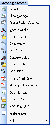 Presenter, which is included in Acrobat 9 Pro Extended (Windows only), integrates into Microsoft PowerPoint and takes advantage of that program’s tools and features. After you have installed Presenter, you access the program from within PowerPoint using the new menu named Adobe Presenter (Figure 1).
