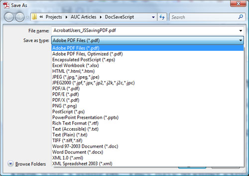 The "doc.saveAs()" function includes input parameters for converting the PDF to a different file format. These are the same formats listed in the SaveAs dialog displayed when the user selects the "File > Save As…" menu item (Figure 1).